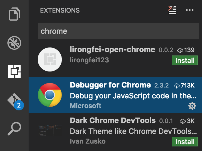 Select the extension named Debugger for Chrome and click the Install button. After doing this, you'll need to reload VS Code to activate the extension. It will persist your workspace across the restart so don't worry about losing any state.