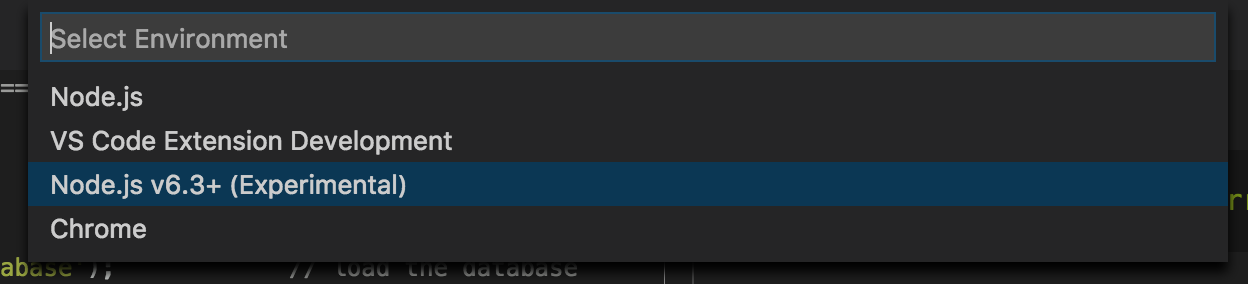 Select Node.js v6.3+ (Experimental), which will use the new Chrome Debugging Protocol support that was recently added to Node.js. Doing this generates a new file in your project called launch.json, which simply tells VS Code how to launch and/or attach to your app in order to debug it.
