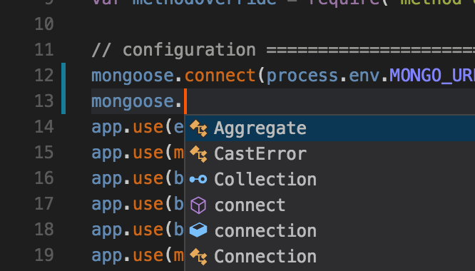 Auto-completion can provide huge productivity enhancements when writing/exploring code, since it prevents you from needing to keep referencing documentation or worrying about API typos. For example, let's augment the hardcoded MongoDB connection string with an environment variable by changing line 12 from this: