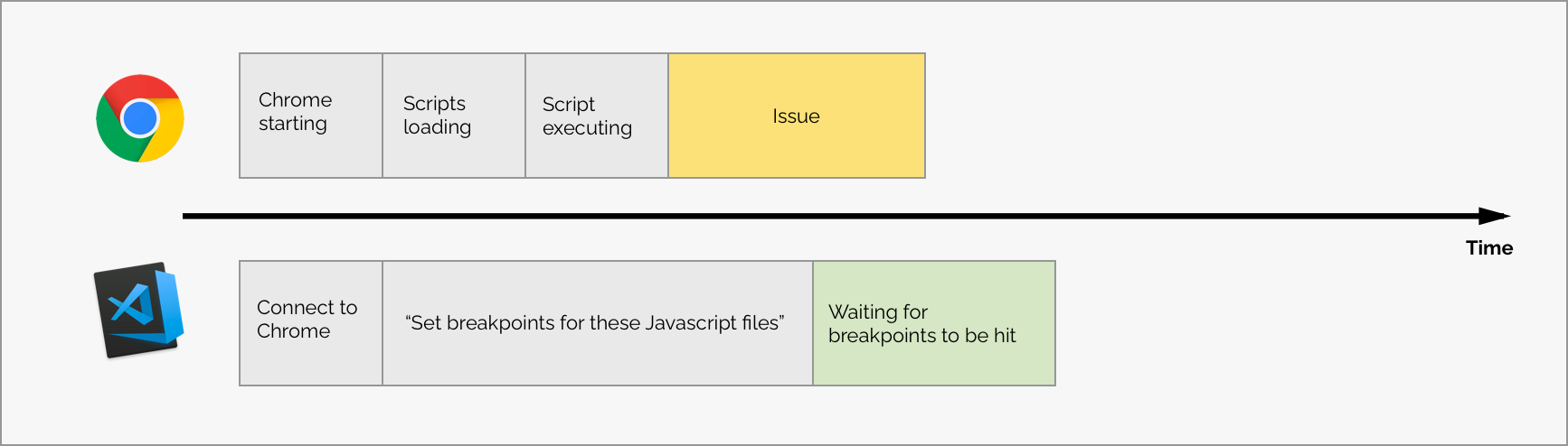 Many users have had the experience that their breakpoints aren't hit when launching Chrome. To add to their confusion, their breakpoints are hit after a simple page refresh. Why would that be? It's a bit complicated, but it comes down to a timing issue between VS Code and Chrome, which is best illustrated in a timeline: